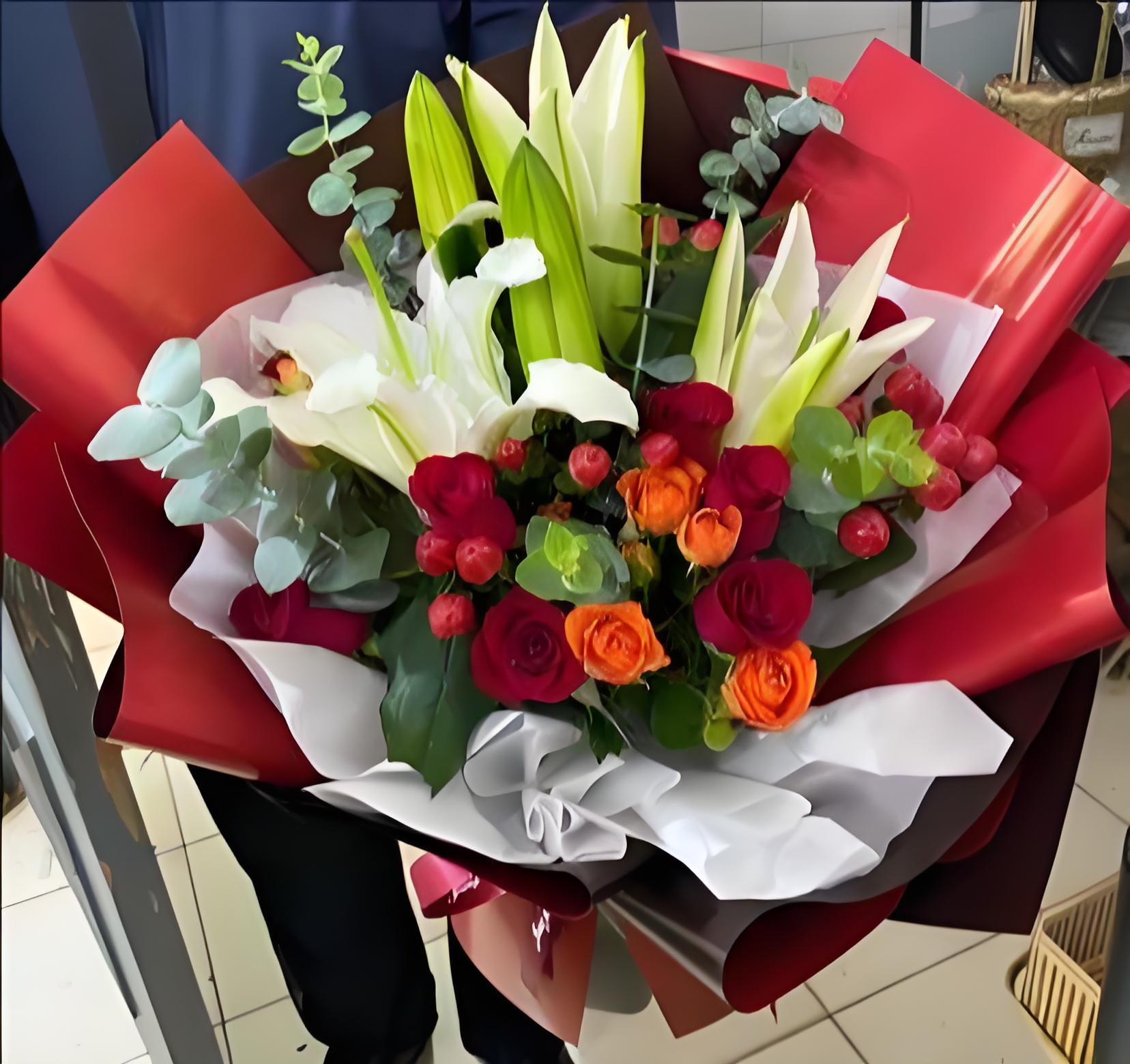 泉州德化县花店包11枝红玫瑰、2枝多头白百合、6枝橙色多头玫瑰、红豆、尤加利叶